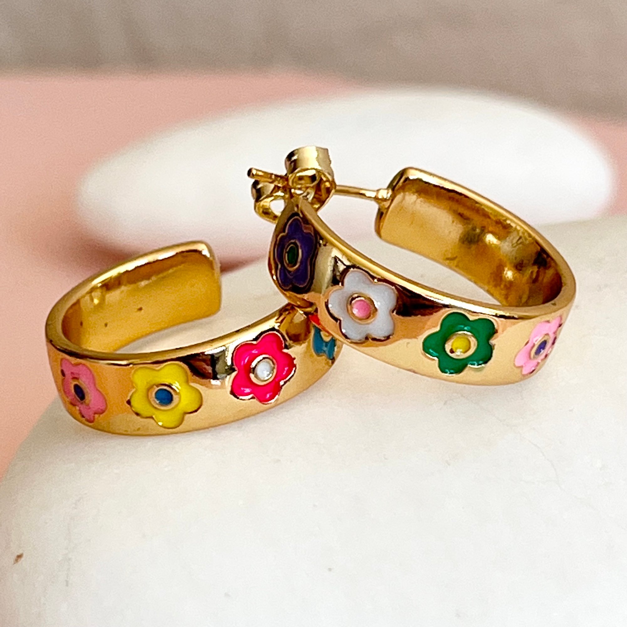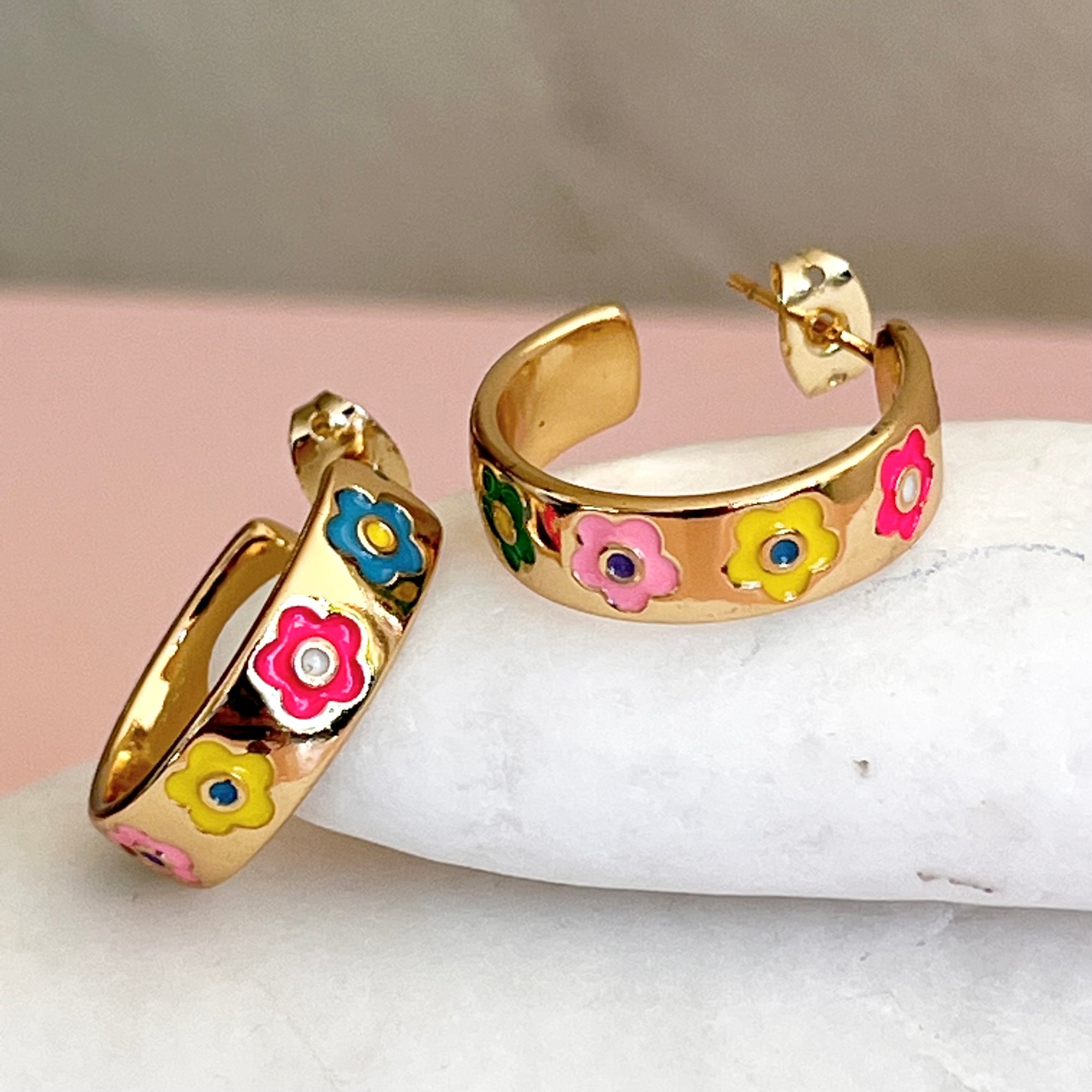 A mid sized hoop style earring - 16k gold plated brass with enamel daisy patterns in multi colours. Size of earring 20mm x 6mm wide. Comes in a cute gift bag.