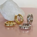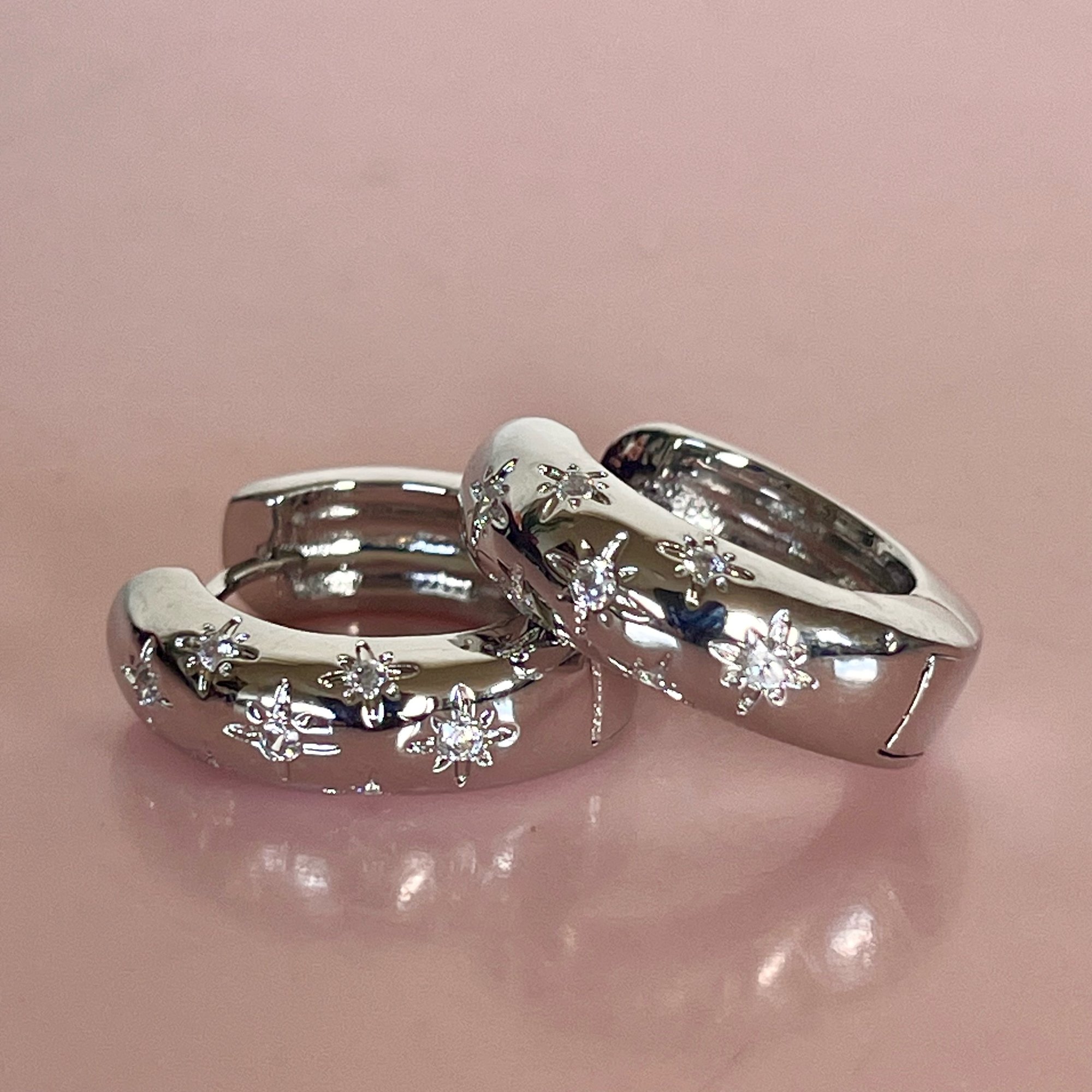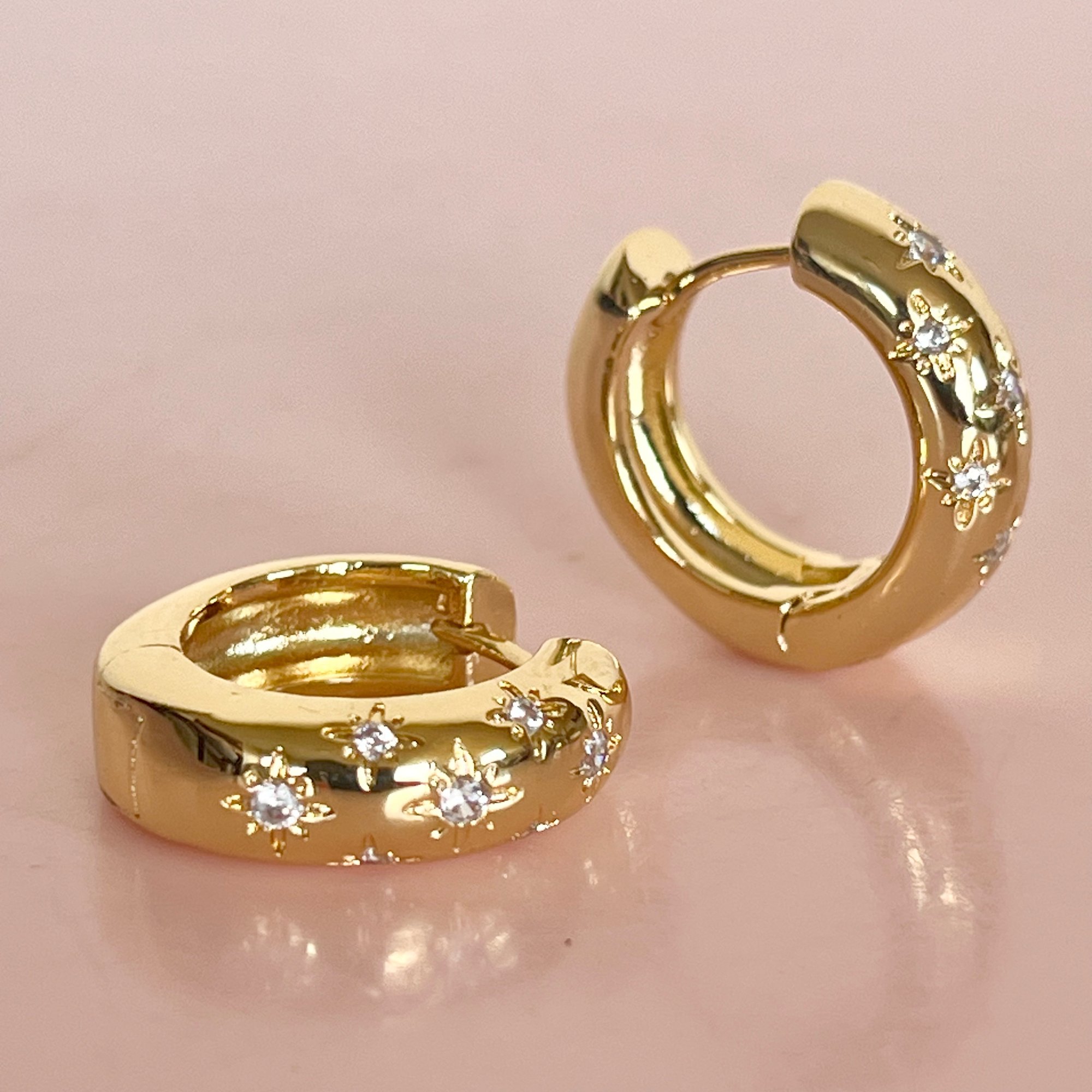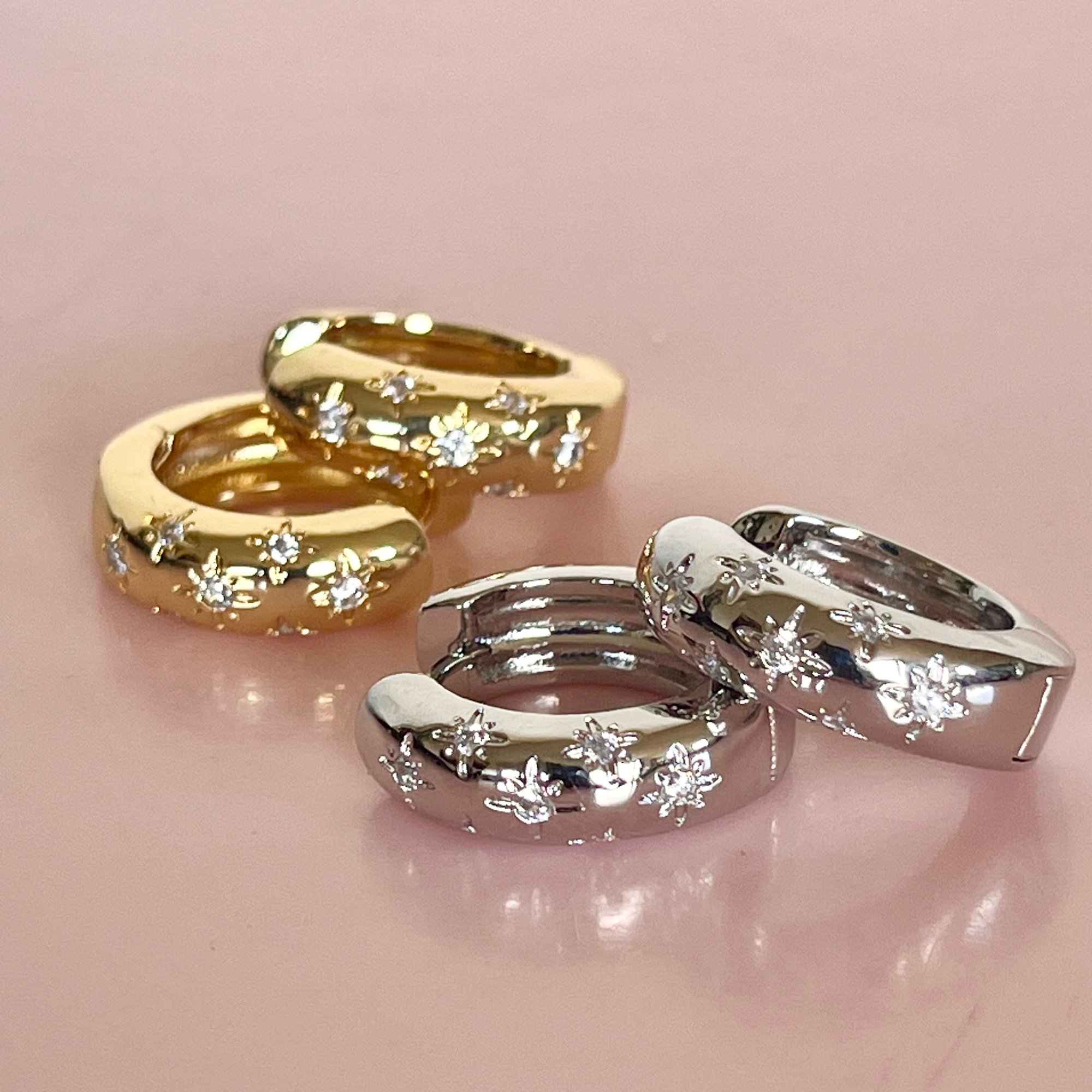 Chunky huggie hoops with a star pattern. Brass Huggies that are either platinum or 18k gold plated with cubic zirconia star patterns. Huggies measure 20x6mm. Comes in a cute gift bag.