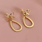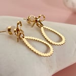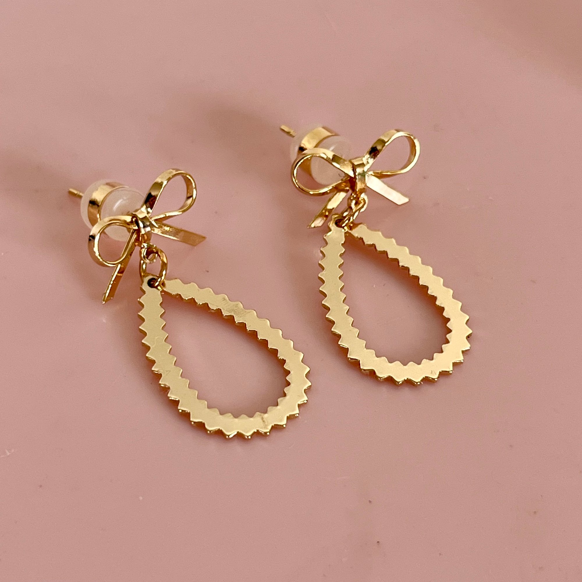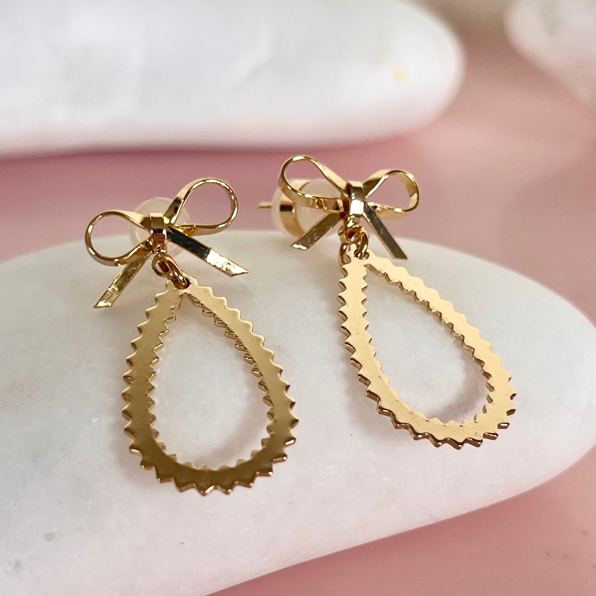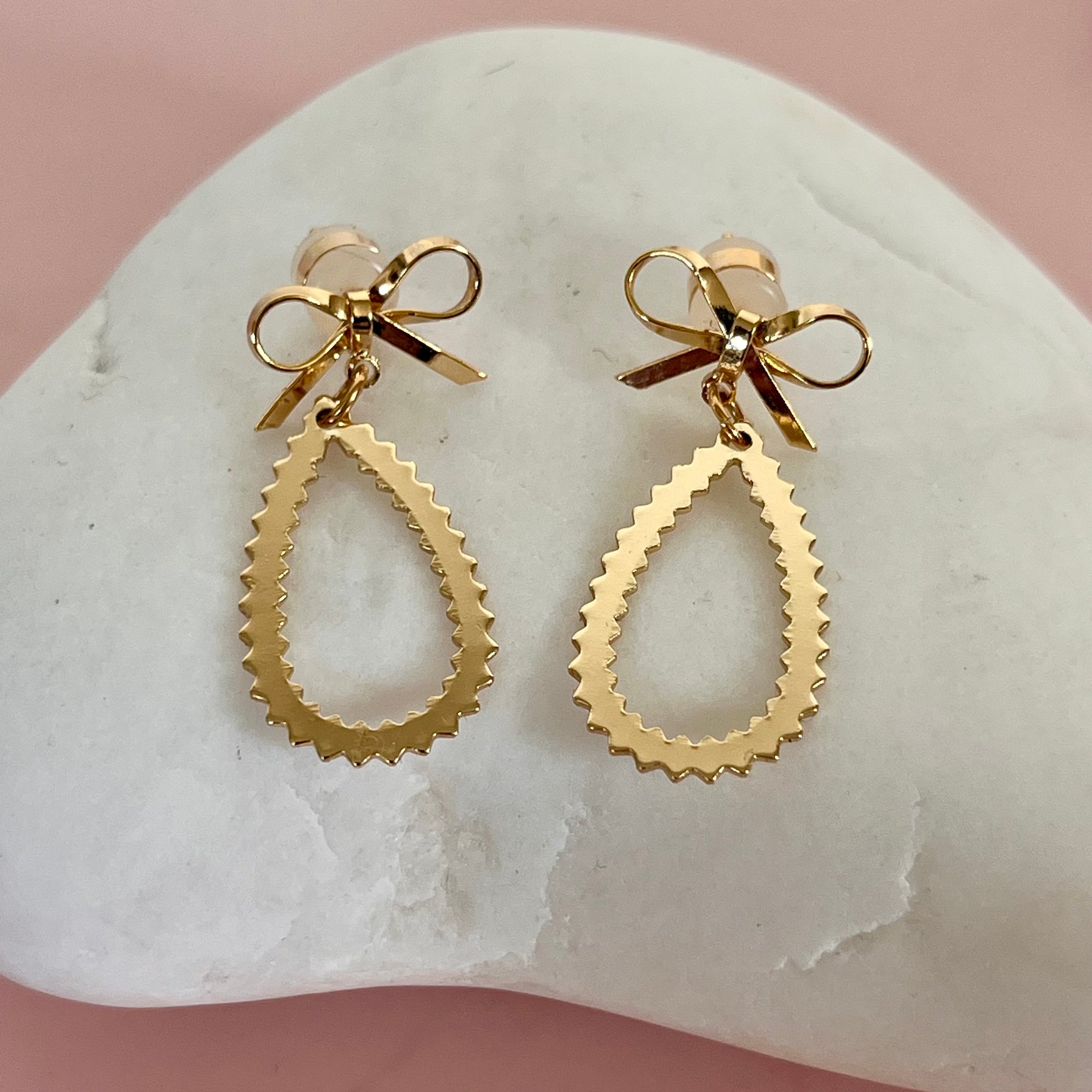 A 18k gold plated bow stud with a 14k gold plated brass cut out tear drop shape. . Teardrop is 23x14mm, stud is 10x15mm and total length of earrings 32mm. Comes in a cute gift bag.