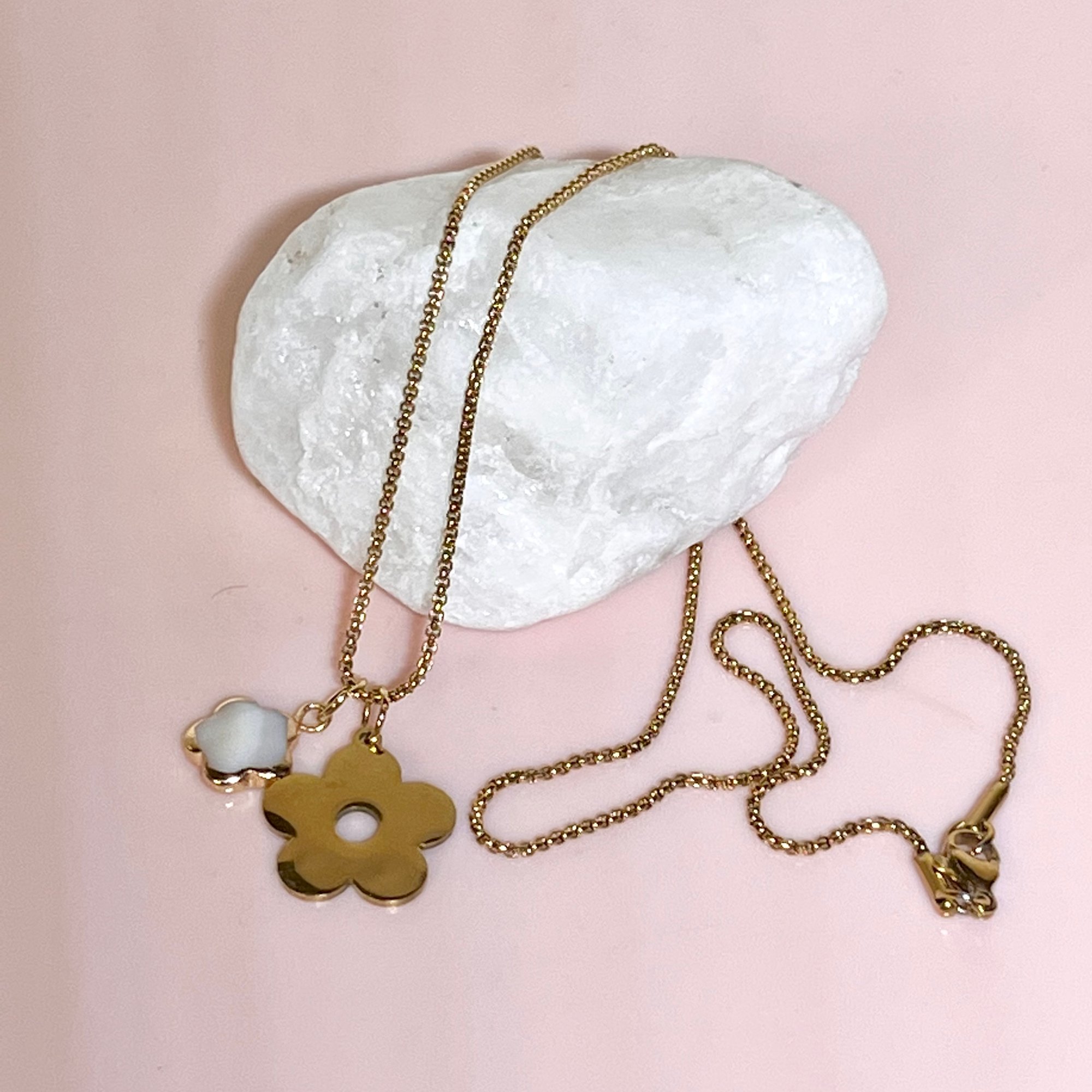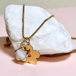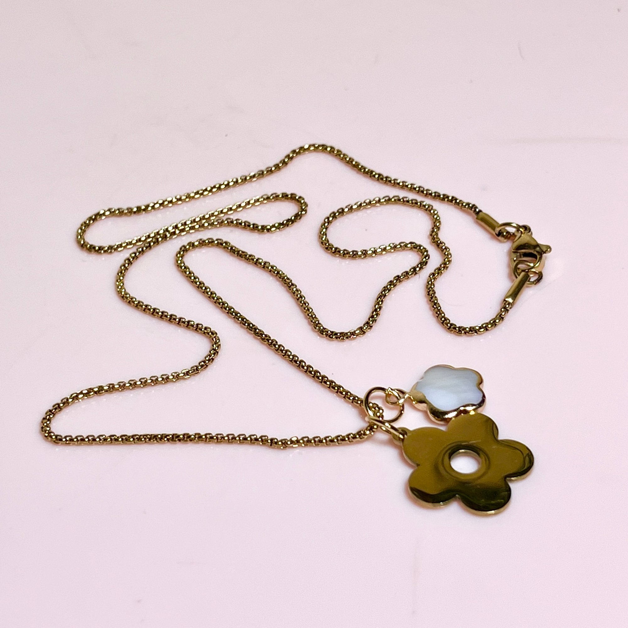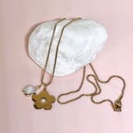 A slightly smaller version of the very popular flower and pearl pendant - this flower charm measures 20mm and is matched with a 10mm shell flower with a gold plated brass outer. The chain is 1.3mm wide and measures 50cm.