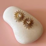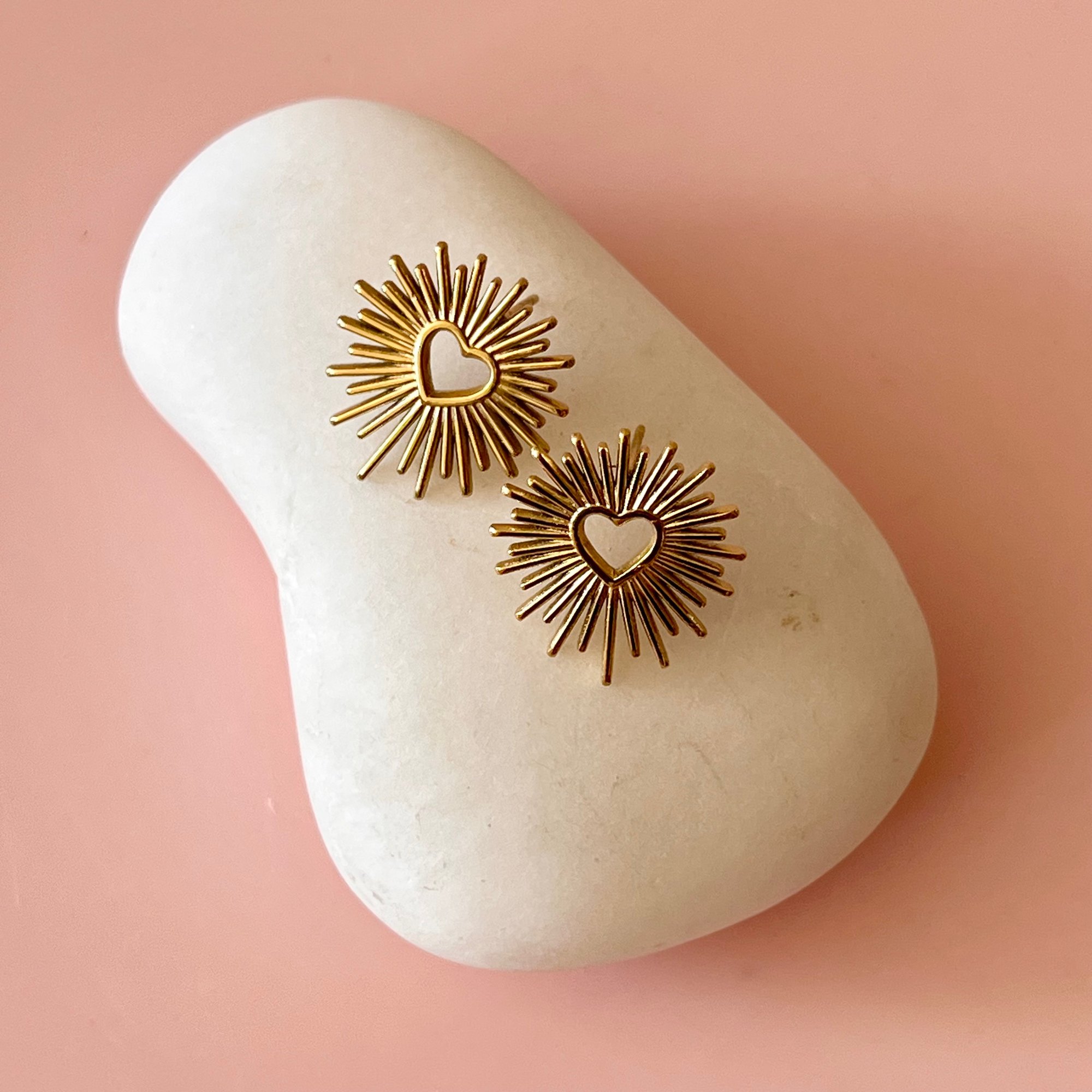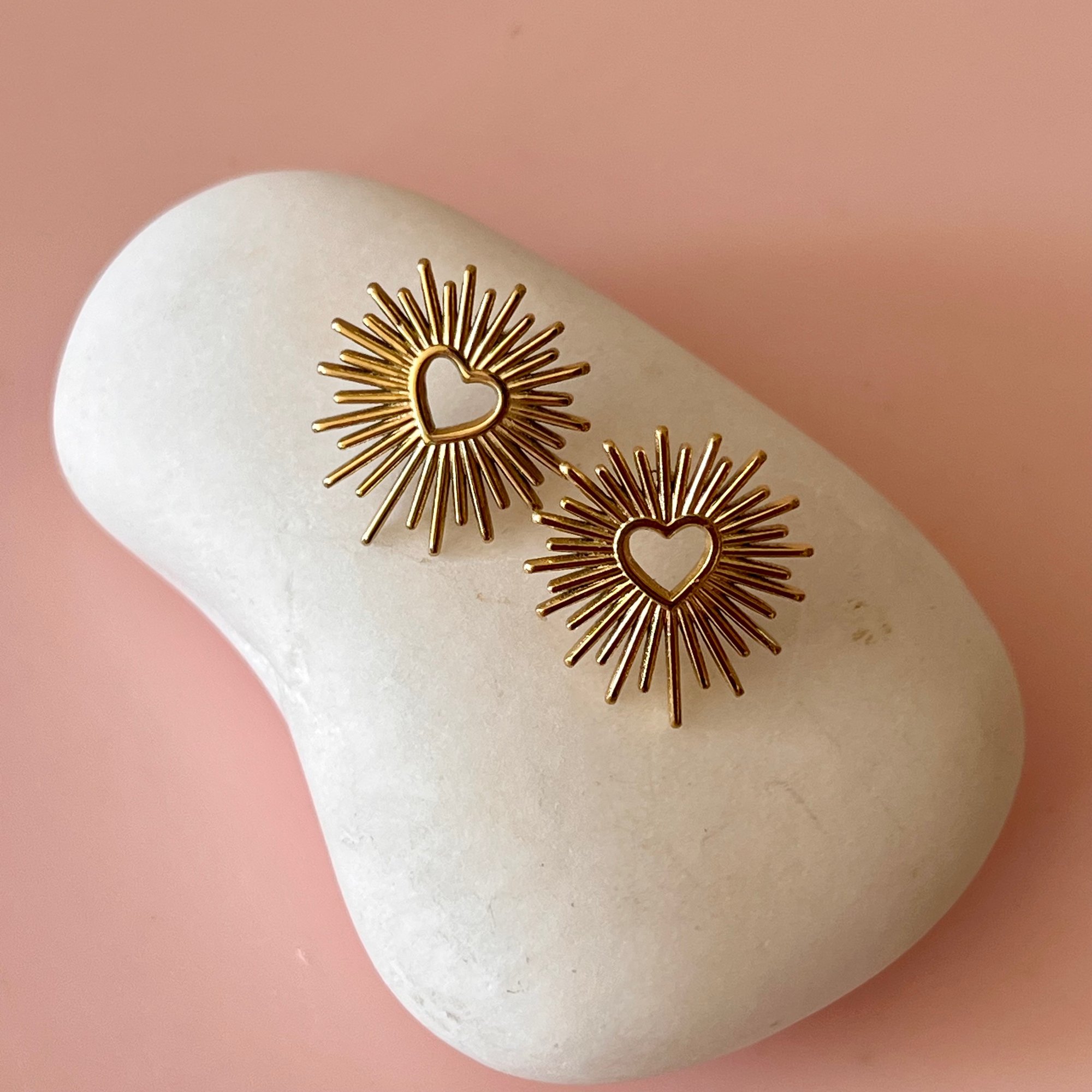 Stainless steel 18k gold plated studs in a heart starburst design. 19.5 x 17.5mm. Comes in a cute gift bag.