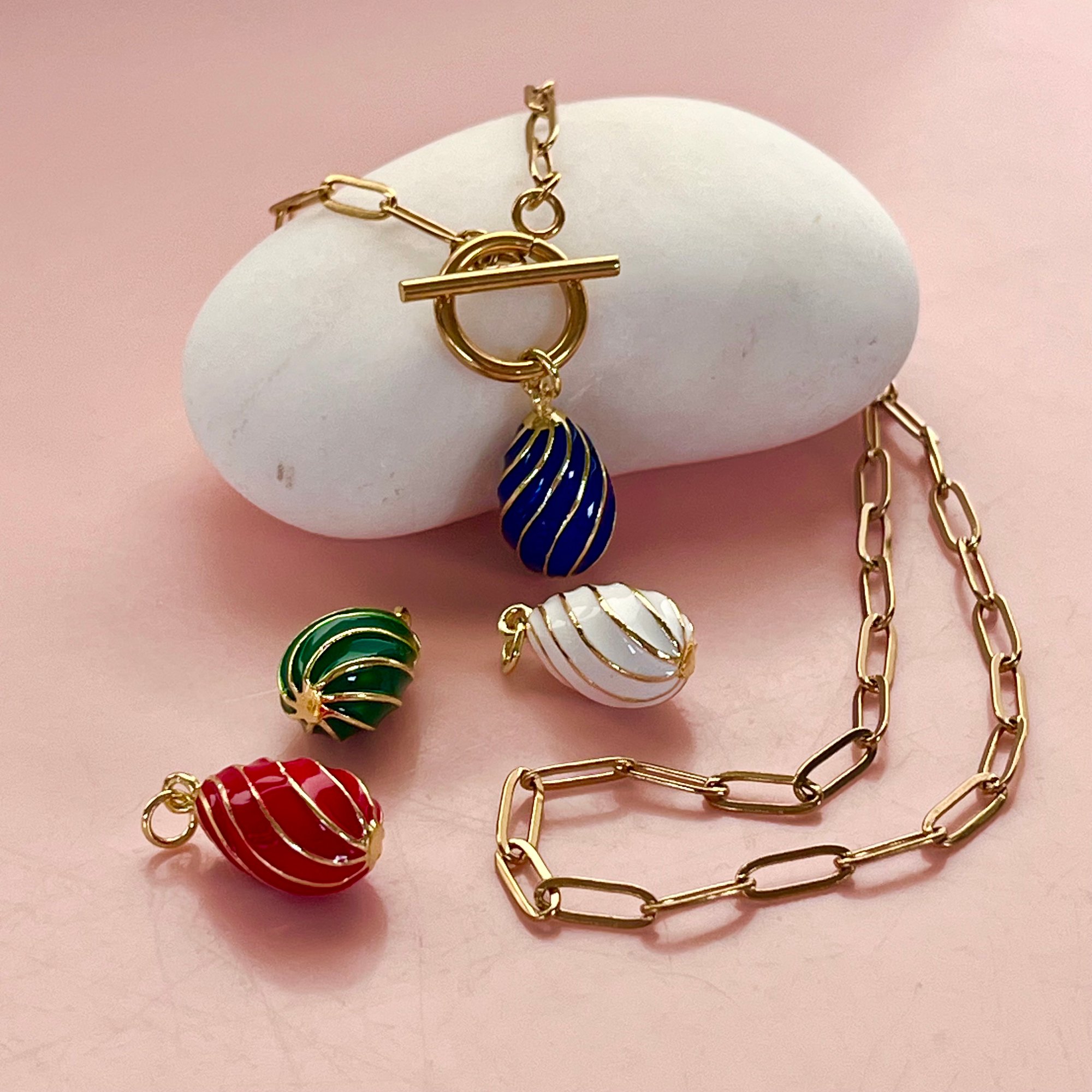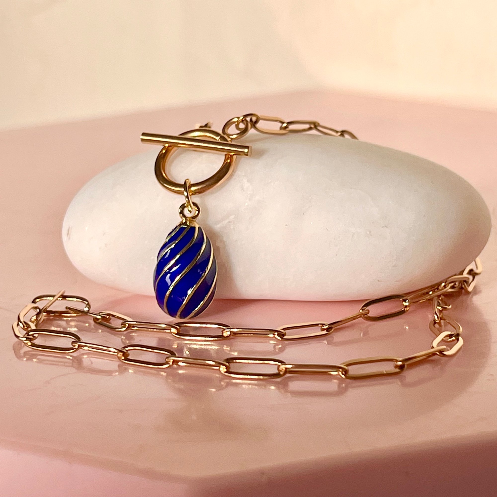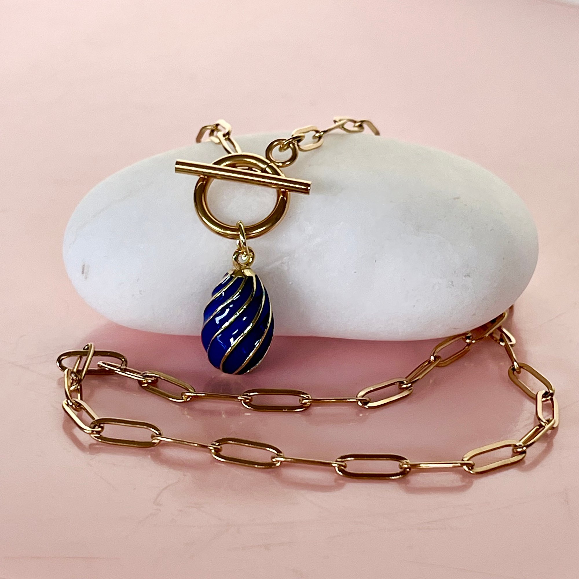 A striped egg shaped drop (brass with 18k gold plate and enamel) 11x20mm on a stainless steel gold plated paperclip chain with a toggle Chain measures 45cm. Only one of each colour available - blue, white, red, green . Comes in a cute gift bag.