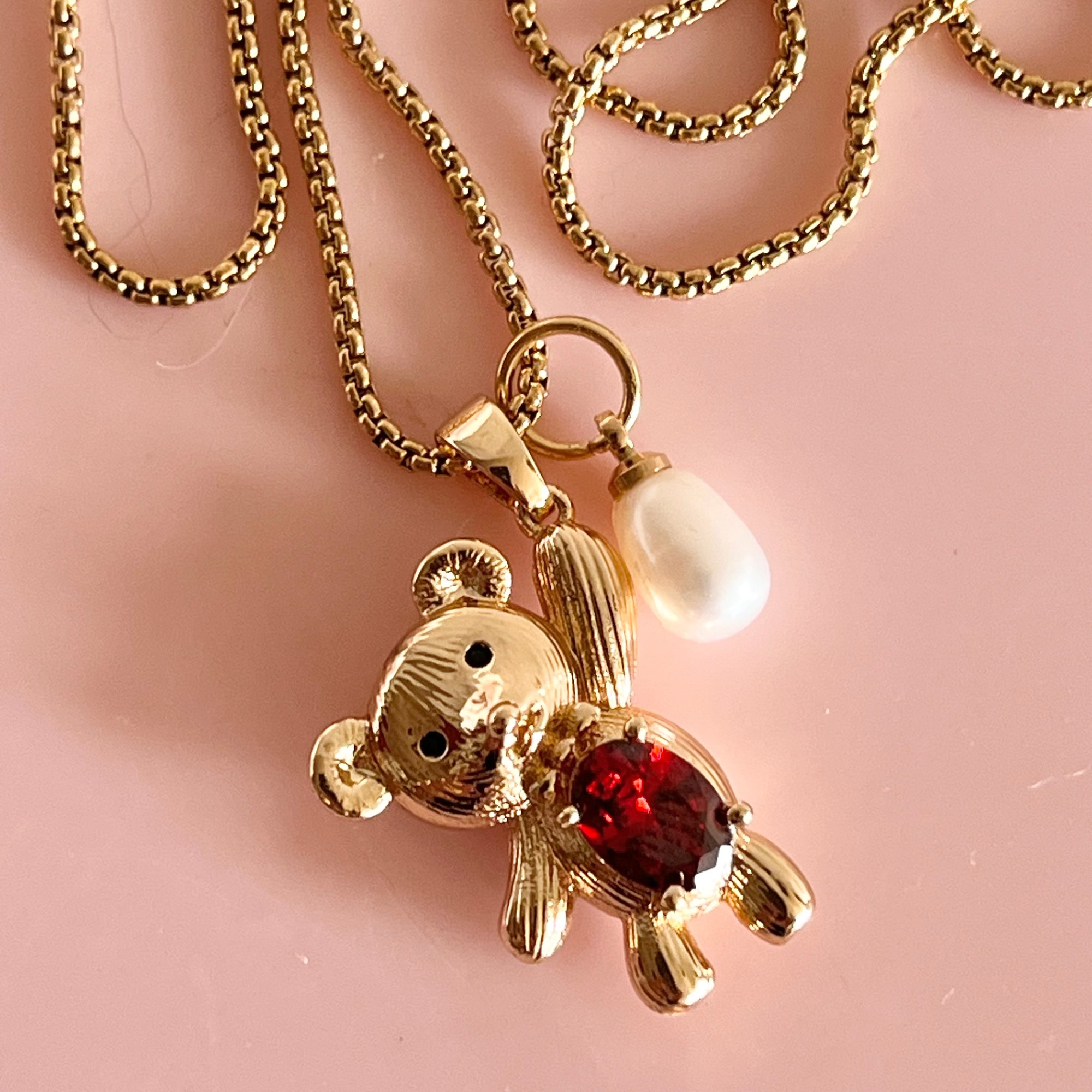 The cutest 18k gold plated brass hanging teddy bear charm with a red glass stone (21x16mm) and a little freshwater pearl. The chain is 1.3mm wide and measures 50cm.