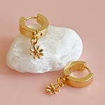 Stainless Steel 24k gold plated Huggie Hoops with a tiny daisy charm. Size of huggies 13mm and daisy 6mm.
