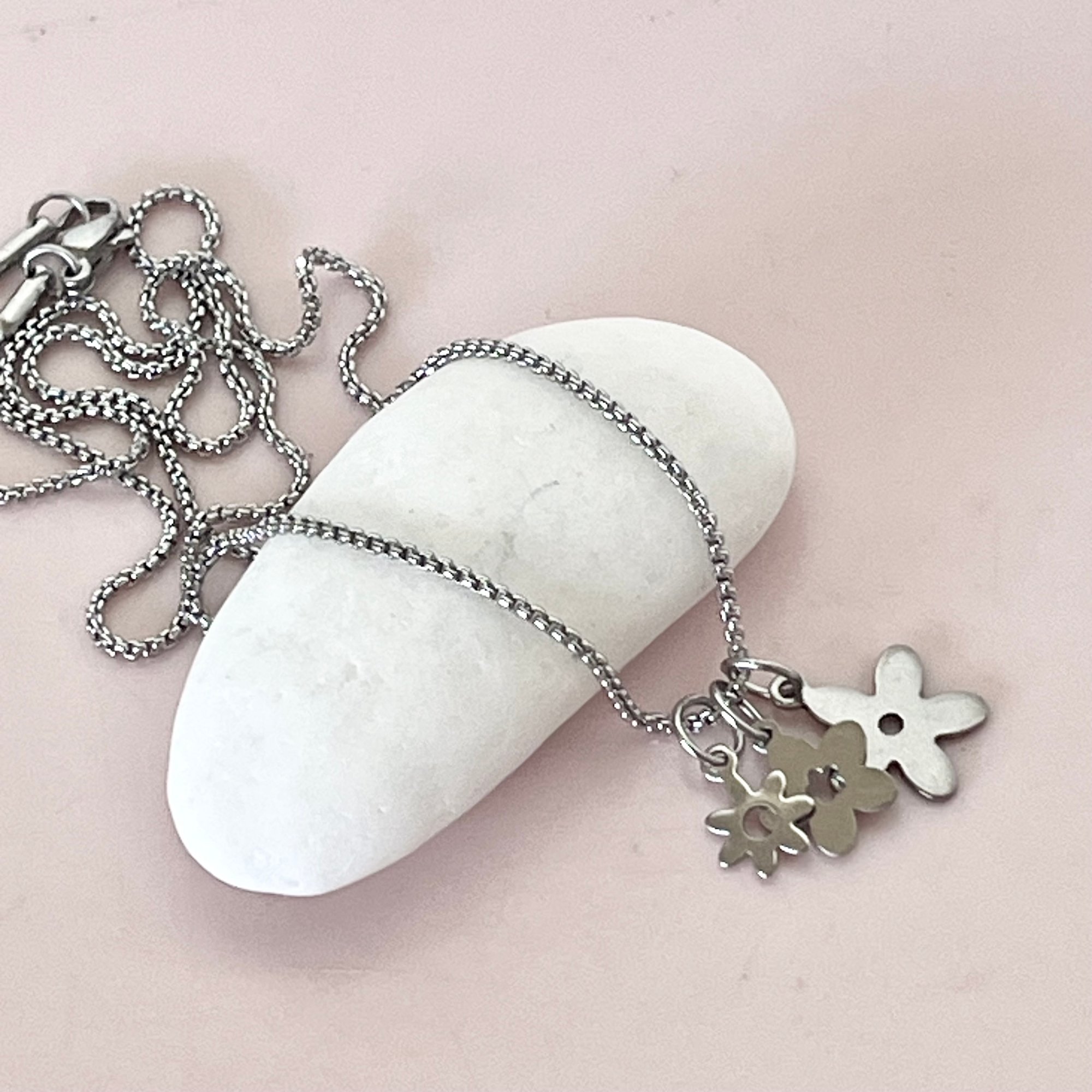 A selection of three stainless steel flower charms (measuring 8mm, 12mm and 15mm) on a fine stainless steel box chain. Chain is 1.3mm wide and measures 50cm.